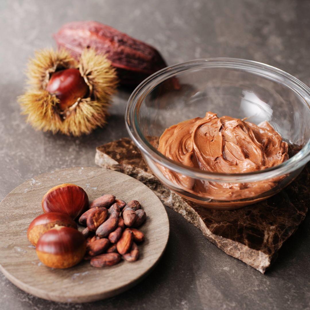 有機カカオを使用したとろける芳醇なショコラバタークリームに、数多ある食材の中から厳選された、和栗のペーストを閉じ込めました。サクッとしたガレットブルトンヌ生地にもカカオを練り込んでいます。