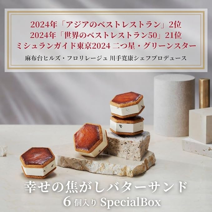 自身がオーナーを務める【フロリレージュ】が最新版の「世界のベストレストラン50」で21位、「アジアのベストレストラン50」で2位に輝くなど国内外から注目を集める川手シェフ。麻布台ヒルズに構える同店は、世界中から人気を集め、滅多に予約の取れない人気店としても知られています。お店以外でも自身の味で幸せを届けたいと、1フレーバー約半年以上かけ口にすると“感動する”というレベルに達するまでこだわり抜き、幸せの焦がしバターサンドを生み出しています。