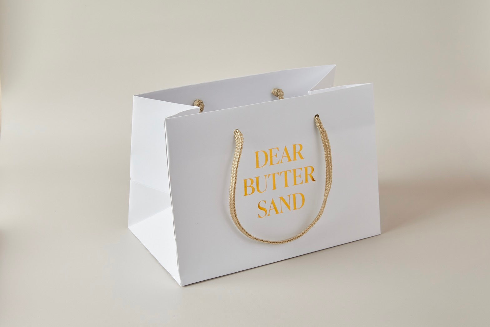 「DEAR BUTTER SAND」の紙袋は、高級感のあるゴールドの光沢のあるロゴが大きく印字されており、洗練されたラグジュアリーなギフトにふさわしいお手提げ袋です。